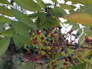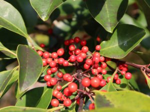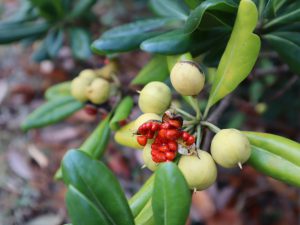 5㎜ほどの紺と赤の2色の実がおしゃれなカイノキ。ツヤッツヤの赤い実がすずなりのハクサンボク、大きな木にオリーブみたいな実が下がったセンダン、プチプチッとイクラに似た実のクロガネモチ。トベラは外皮がはじけて、中からネットリしたオレンジの実が現れ始めました。