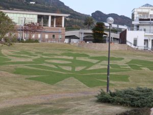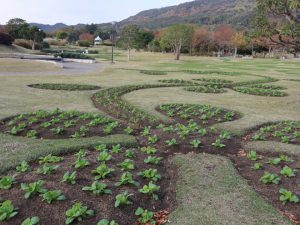 年末から咲く寒咲きナノハナの現在の様子です。着々と育っています。その横には、ペレニアルライグラスという植物で描いた芝生の地上絵がくっきり。