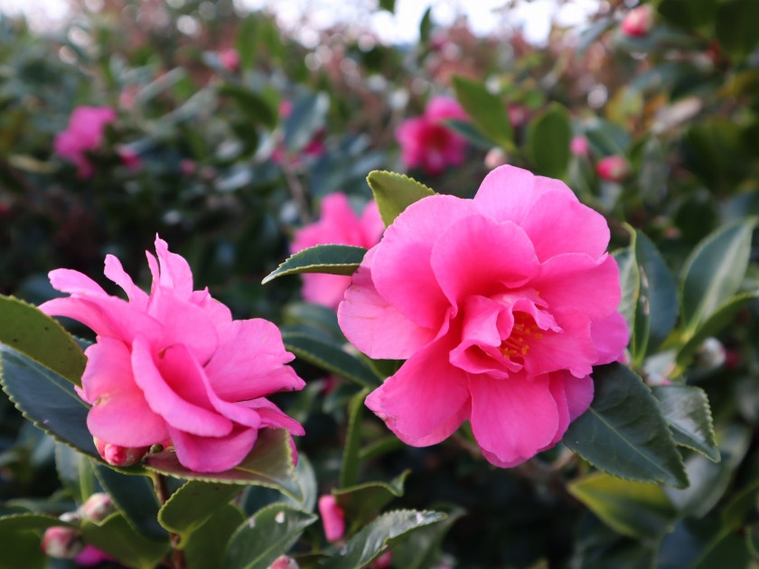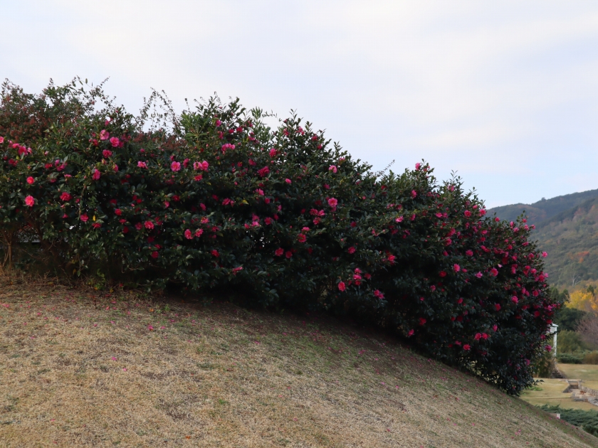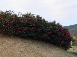 写真一・二枚目:カンツバキ(場所:移ろいの庭、東浦口ゲートそばほか)
