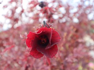 枝葉と同じ赤黒い花。日差しのない時はおどろおどろしい雰囲気。
