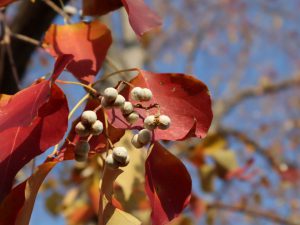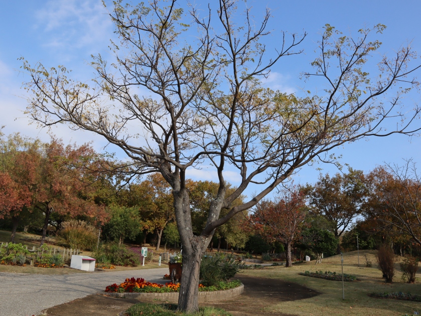 写真一・二枚目:ナンキンハゼ(場所:連絡口ゲートそば、子供の森ほか)、三・四枚目:ラクウショウ(場所:水の樹周辺ほか)