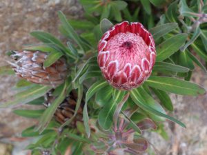 10㎝ほどの大き目な花、プロテア。開花時期は不明で現在2つのみ咲いていますが、つぼみは沢山ついています。そばにはこれより更に大きな花、キングプロテアもあります。