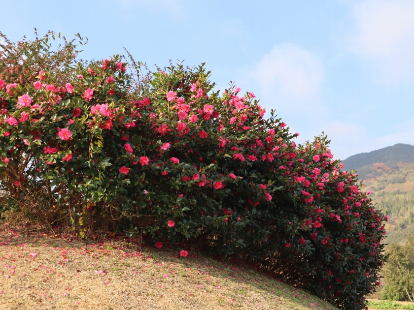 写真一・二枚目:カンツバキ(場所:移ろいの庭、東浦口ゲートそばほか)