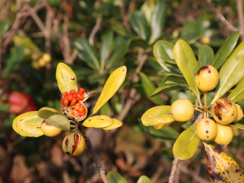 トベラは外皮がはじけて、中からネットリしたオレンジの実が現れています。ラクウショウはゴツゴツの2~3㎝の実がボッテリ。ハクサンボクはツヤッツヤの赤い実がすずなり。