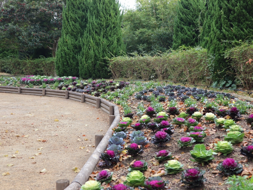 写真一・二枚目:ハボタン(場所:花の丘道 半円形花壇)