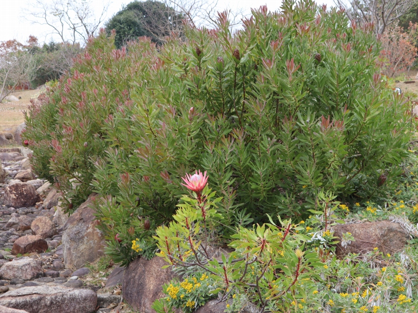 つぼみがたくさんついているプロテアを見守っていたのですが、その隣のキングプロテアが咲きました。(写真二枚目の上半分を占めているのがプロテアです)