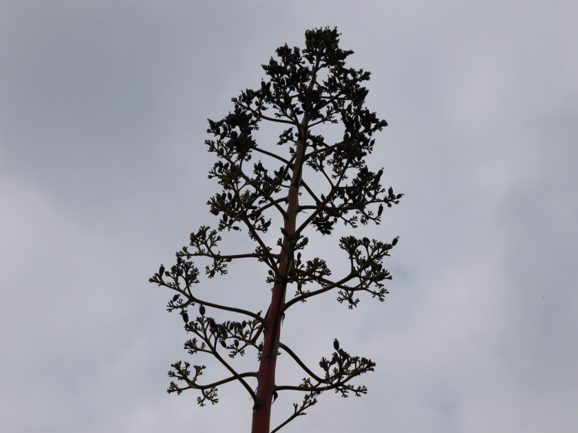 夏に話題となったアオノリュウゼツランのその後の様子です。全体青々としていた状態から、葉状部はしなび、幹状部は木のように茶色くなり、花の部分は実が出来ています。興味があれば元気な状態(夏に撮影した公園の花風景動画)と見比べてみてください。