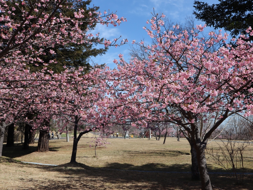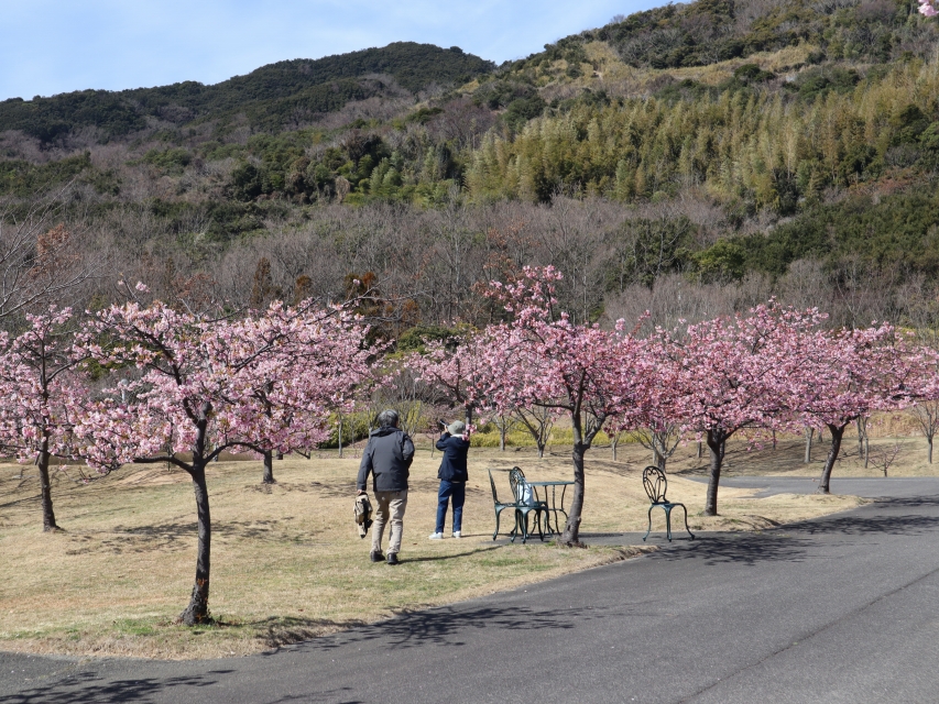 写真一枚目:エリアの奥にある大きな河津桜、二枚目:丘の入り口の河津桜の並木
