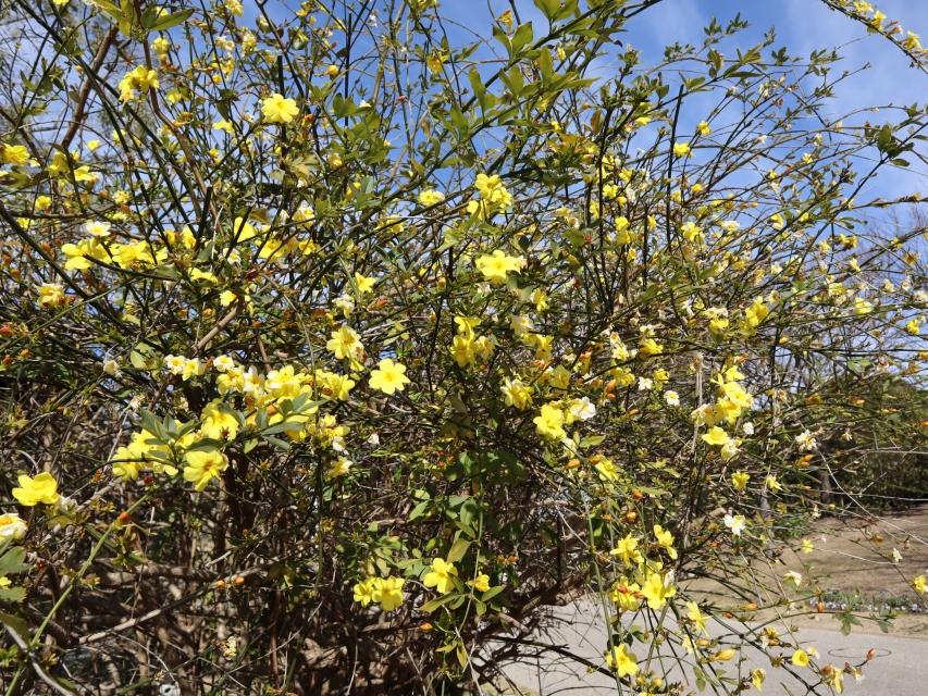 写真一枚目:ハボタン(場所:花の丘道(半円形花壇))、二枚目:ウンナンオウバイ(雲南黄梅)(場所:花の丘道)
