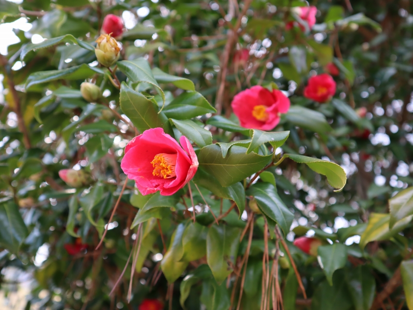 赤、白、ピンクの椿類は、つぼみがたくさん付いてますのでまだまだ咲き続けます。