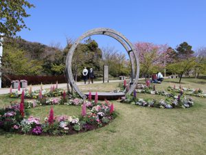 写真一枚目:テラコッタ人形(場所:園内各所)、二枚目:フォトリング(場所:ポプラの丘)