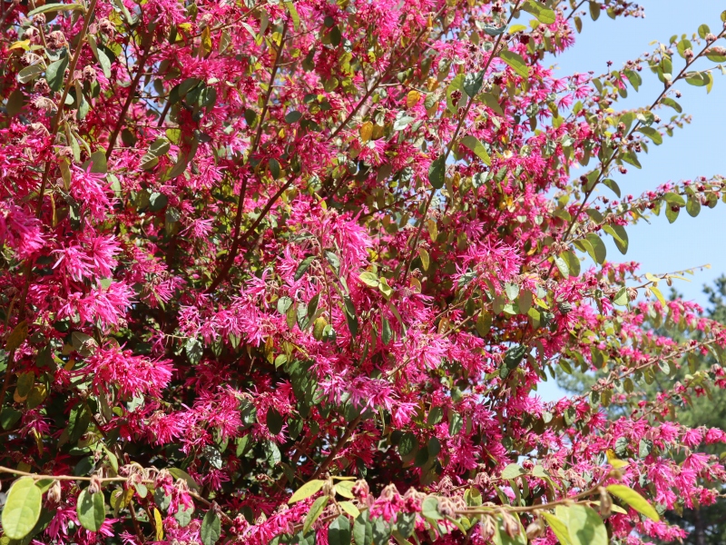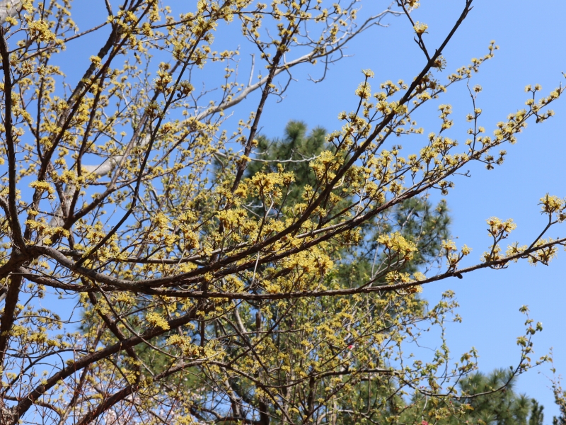 写真一枚目:ベニバナトキワマンサク、二枚目:サンシュユ