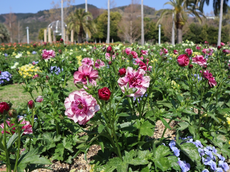 ヤシの木を背景に花びらがぴかぴか光るラナンキュラス‘ラックス・シリーズ’の新しい花壇ができました!