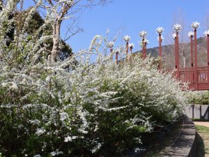 ユキヤナギは雪のように真っ白なものの他に、うっすらピンクもあります。可憐な花が園内を飾ってくれています。
