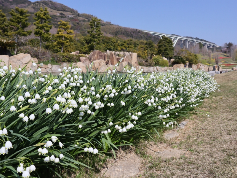 写真一枚目:ユキヤナギ(場所:灘川沿いほか園内各所)、二枚目:ビオラ(場所:移ろいの庭 階段花壇ほか)