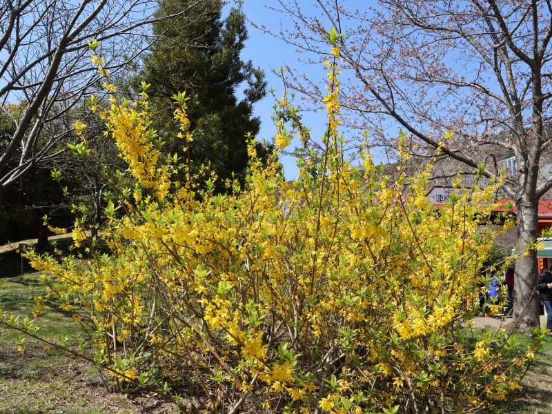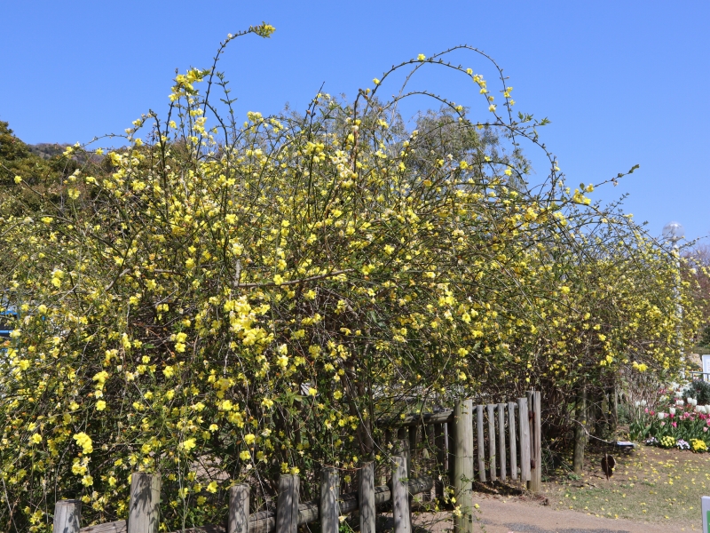 写真一枚目:ウンナンオウバイ(場所:花の丘道ほか)、二枚目:レンギョウ(場所:連絡口ゲート、花の谷)
