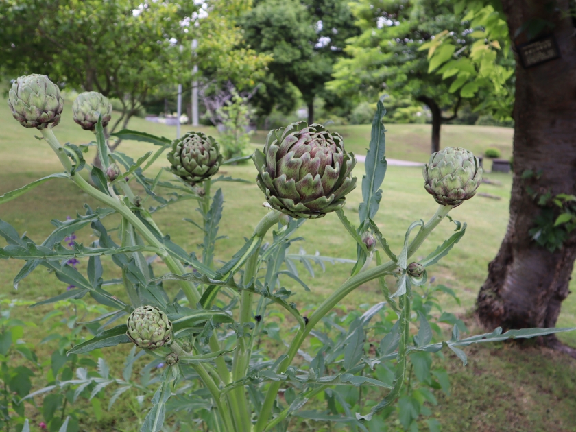 花の丘道はハーブ類のお花が満開です。毎年人気のアーティチョークも元気よく伸びてきました。開花をお楽しみに。