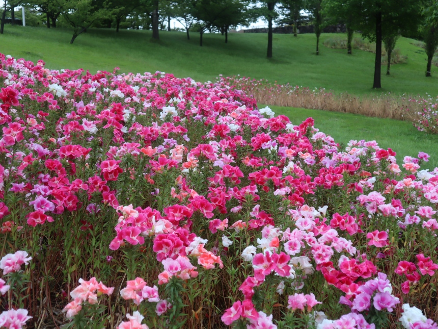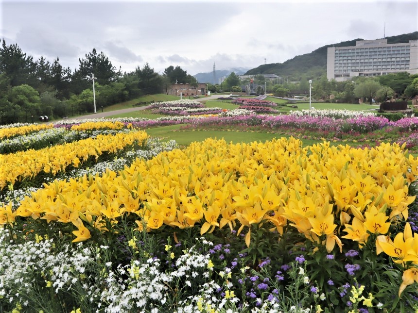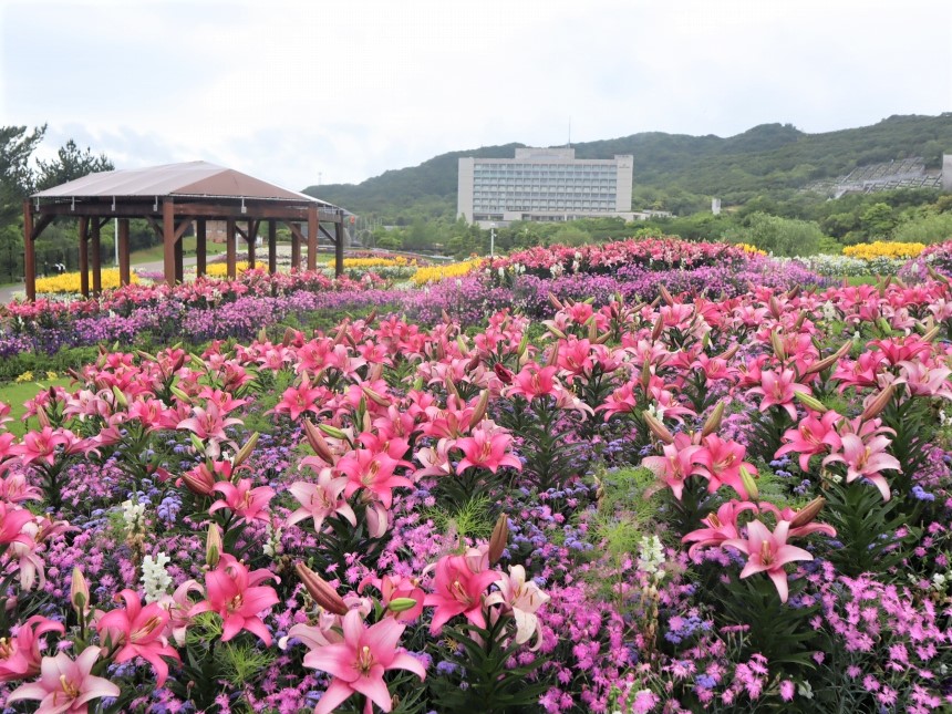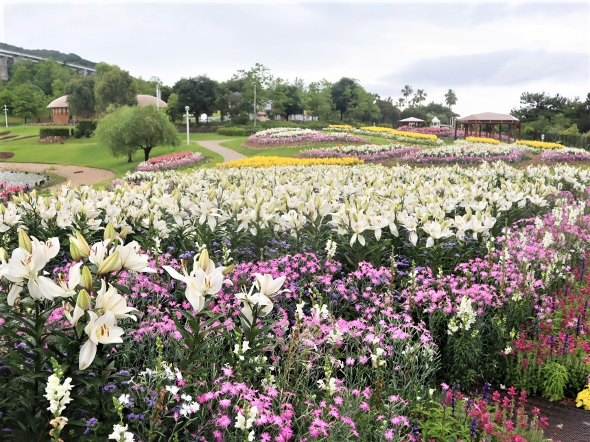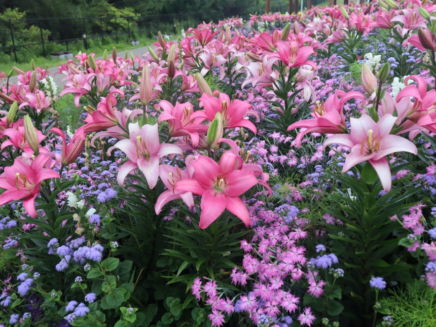 黄・白・桃の3色のユリが見ごろになりました!ユリの周りには、ピンクや白のダイアンサスやサルビア、アゲラタムなどたくさんのお花が咲き競っています。