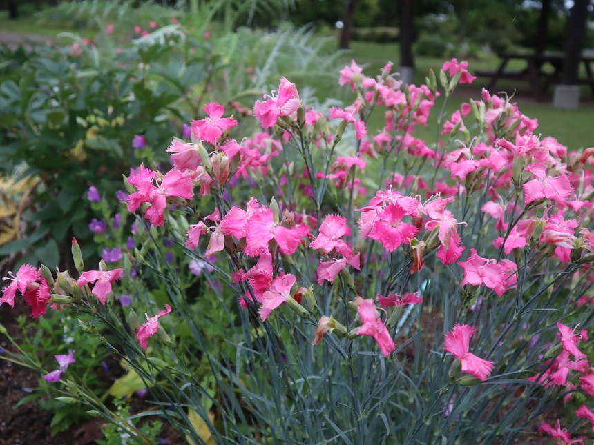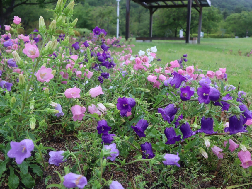 ゴデチアとカンパニュラは見頃のピークは過ぎましたが、まだビシッと咲いています。雨にあたってでちょっと下向き気味?