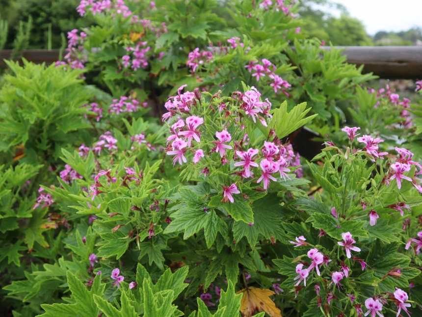 写真一枚目:アーティチョーク、二枚目:クローブピンク、三枚目:コモンマロウ、四枚目:センテッドゼラニウム(場所:すべて花の丘道)
