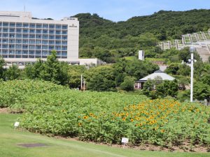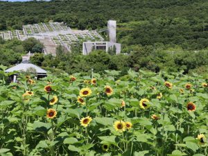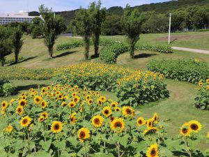 写真一・二枚目:‘ゴッホのひまわり’(場所:ポプラの丘)、三・四枚目:ポプラの丘の様子、五・六枚目:大地の虹南花壇の様子