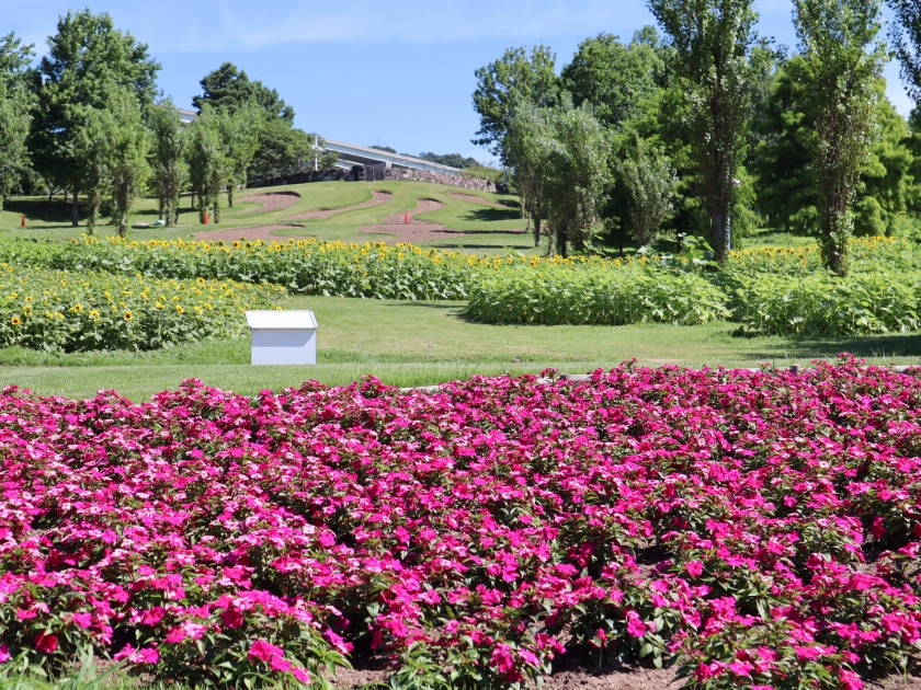 ポプラの丘と大地の虹を彩っている花。ヒマワリの黄色との対比がパキッとビビッド!