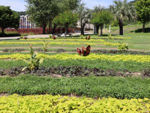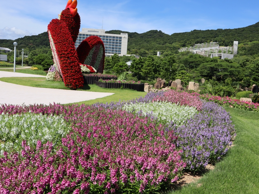 立体花壇「花火鳥」の尾羽部分を飾る花。ボリュームが出てきました。