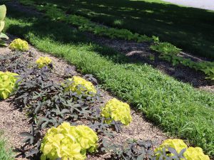 サツマイモの葉っぱに似た形のイポメア。黄緑色と深緑色の2種を植えています(※写真2枚目の黄緑色の植物はコリウスです)。
