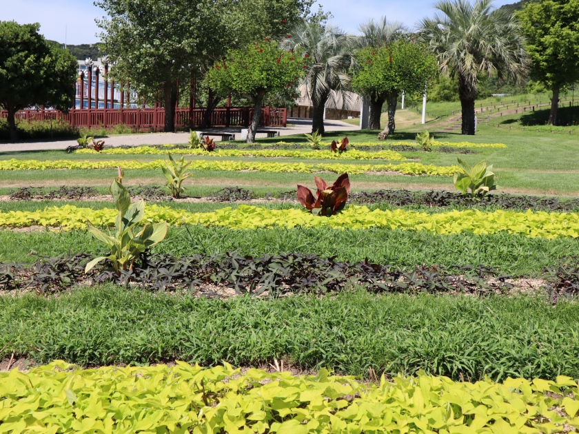 写真一・二枚目:イポメア(場所:パームガーデン、移ろいの庭階段花壇ほか)