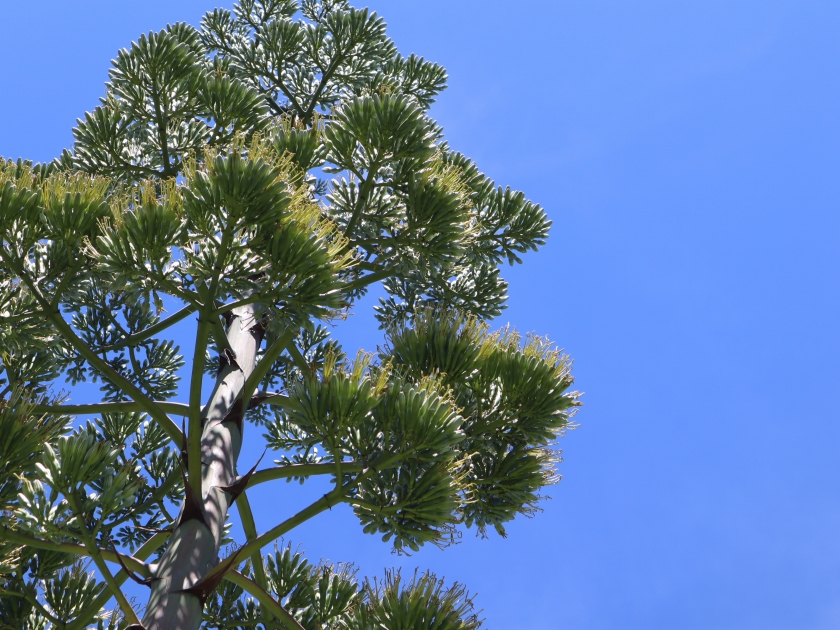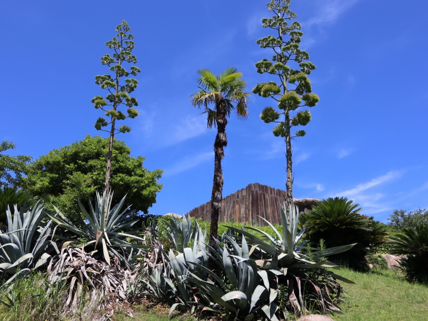 花の谷から空のテラスを見上げると、8メートル以上にまで伸びた3本のニョキニョキッとした植物、それがアオノリュウゼツランです。滅多に花が咲くことはなく、数十年かけてたった一度だけ咲き、その後は静かに枯れていきます。7月18日に開花しました。下から上に向かって開花が進みます。