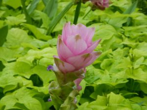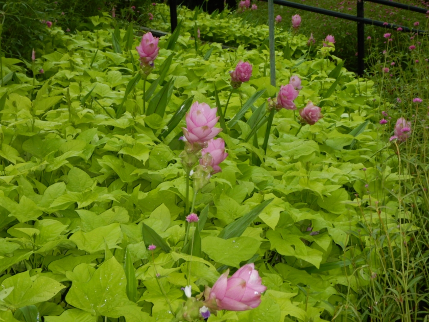 写真一・二枚目:クルクマ(場所:移ろいの庭階段花壇ほか)