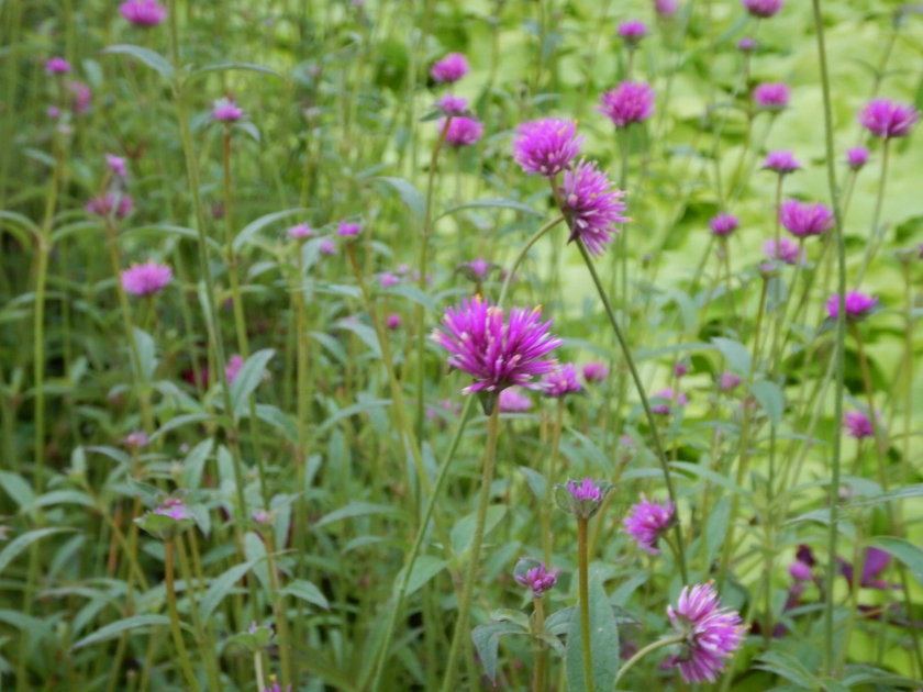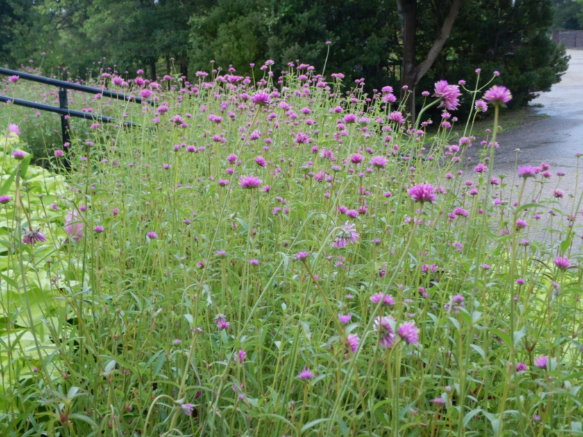 写真一・二枚目:センニチコウ‘ファイヤーワークス’(場所:移ろいの庭階段花壇、レストラン花屋敷前)