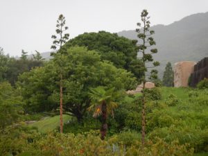 花の谷から空のテラスを見上げると、8メートル以上にまで伸びた3本のニョキニョキッとした植物、それがアオノリュウゼツランです。滅多に花が咲くことはなく、数十年かけてたった一度だけ咲き、その後は静かに枯れていきます。