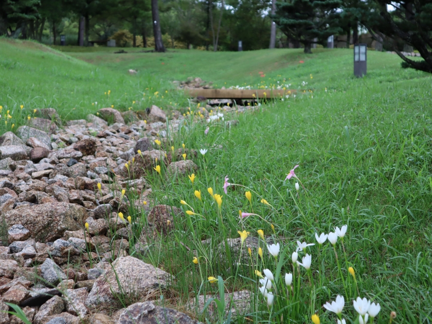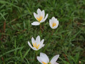 写真一・二枚目:ゼフィランサス、三枚目:ヒガンバナ、四枚目:松の谷の様子(場所:松の谷)