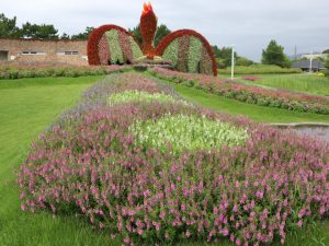 写真一枚目:アンゲロニア(場所:大地の虹、移ろいの庭ほか)、二枚目:ペンタス(場所:大地の虹)三枚目:ベゴニア(場所:立体花壇「花火鳥」ほか)、四枚目:「花火鳥」の後ろ姿