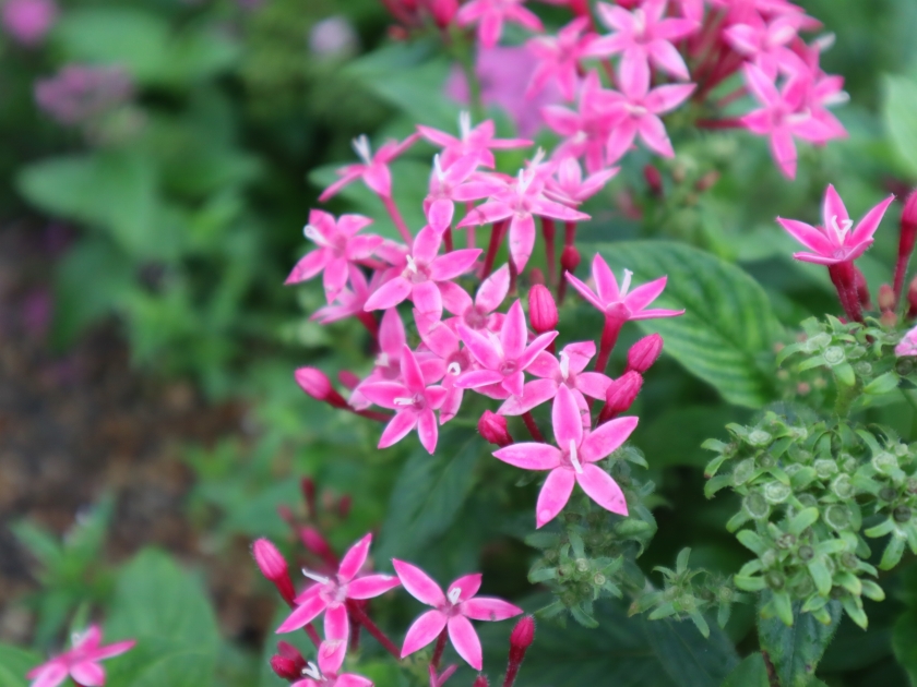 小ぶりのピンクのポンポンが茎の先にビョコビョコ出ています。名称通りに花火っぽい見た目の花です(ファイヤーワーク:花火)。