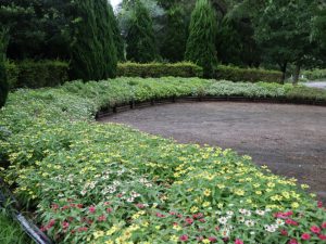 連絡口ゲートから入って突き当りの半円形花壇。咲きそろってきました。が!これもショボショボに…。