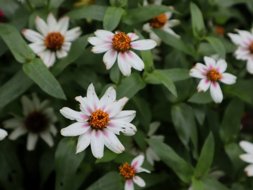 写真一・二枚目:ジニア(百日草)(場所:花の丘道半円形花壇)