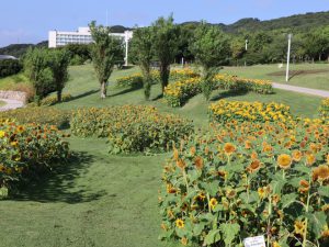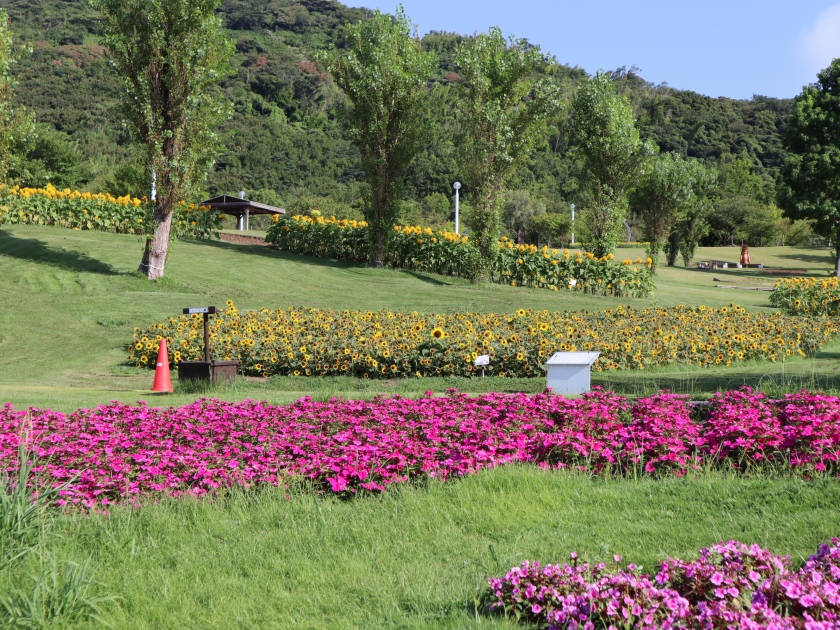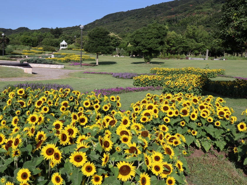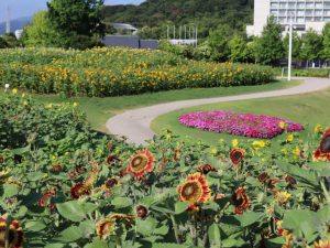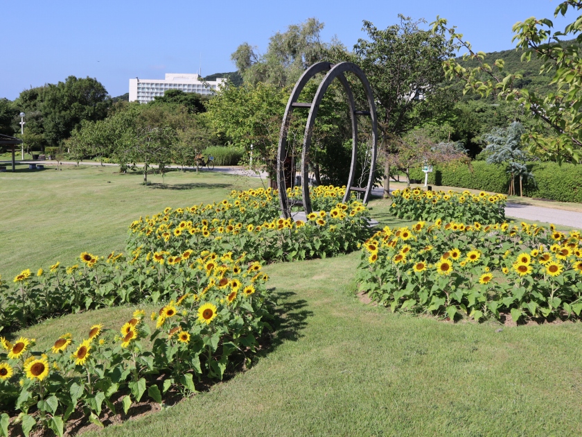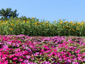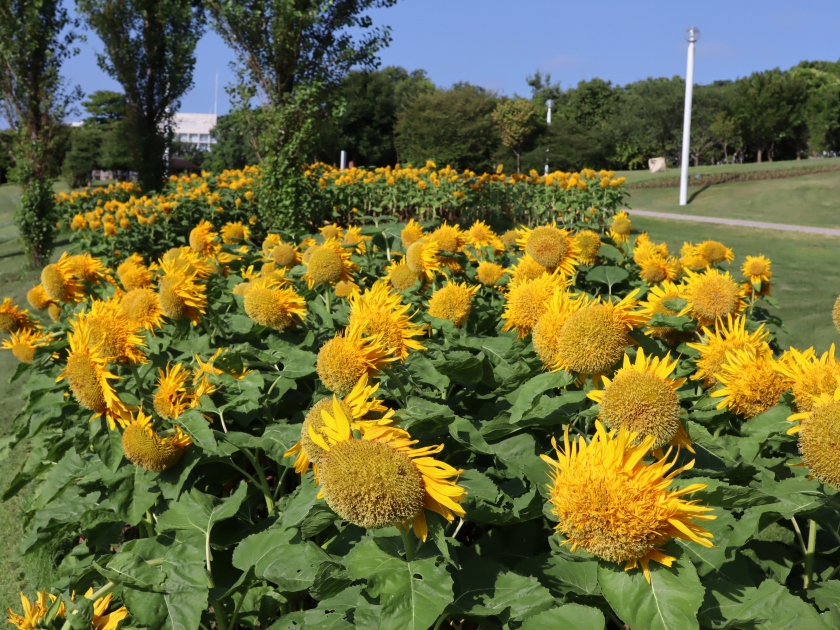 移ろいの庭は満開です。大地の虹南花壇では複数の品種がチョコッとずつ楽しめます。ポプラの丘はピークを過ぎましたが、山側にあるフォトリングの周りのヒマワリはきれいに満開です。