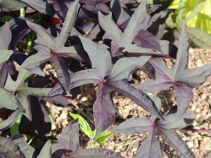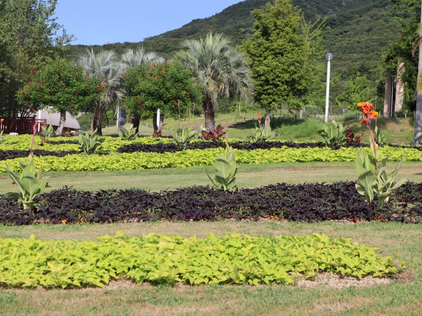 写真一・二枚目:イポメア(場所:パームガーデン、移ろいの庭階段花壇ほか)
