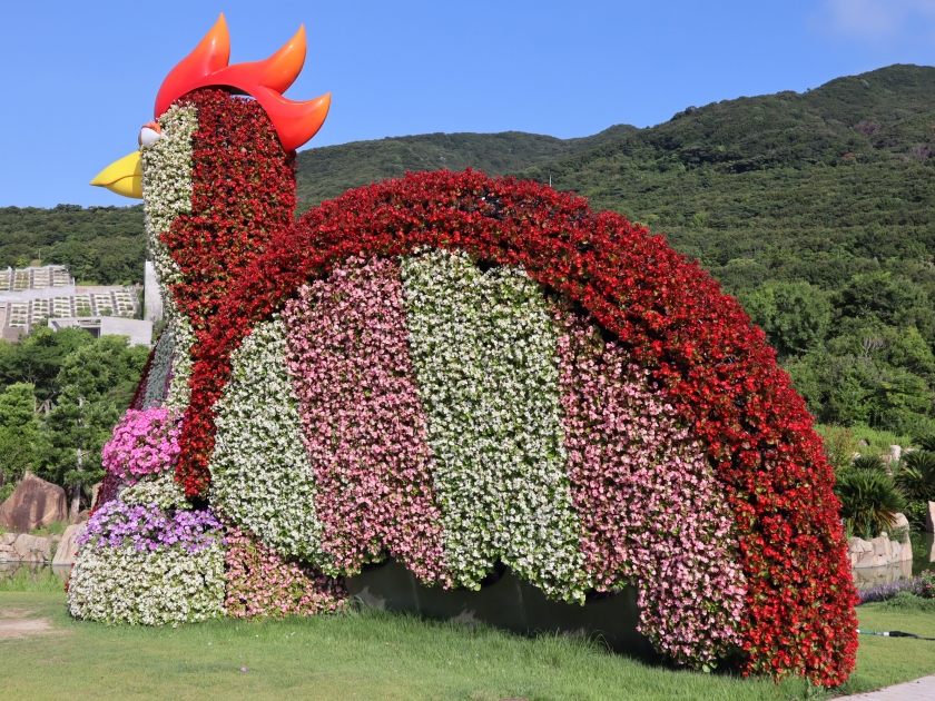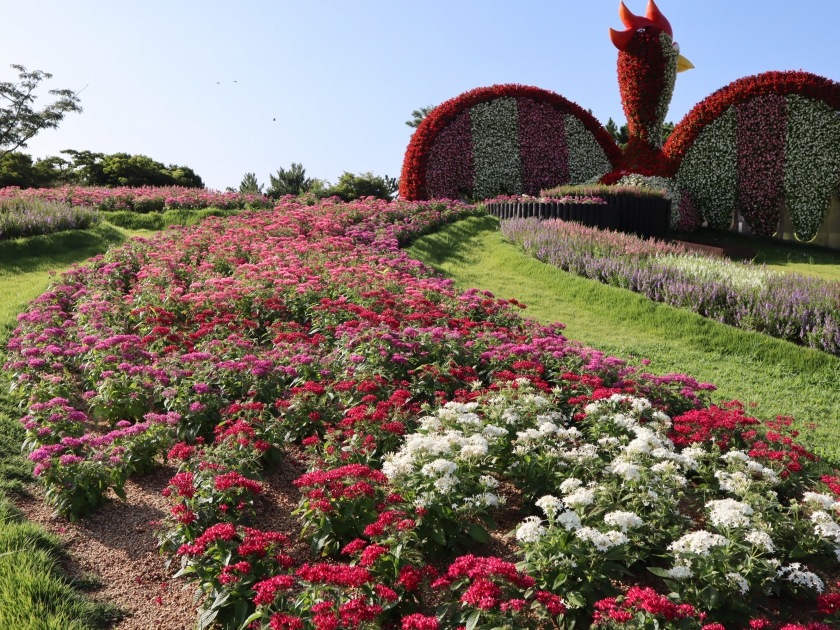 立体花壇「花火鳥」の尾羽部分を飾る花。どちらもボリュームが出てきました。