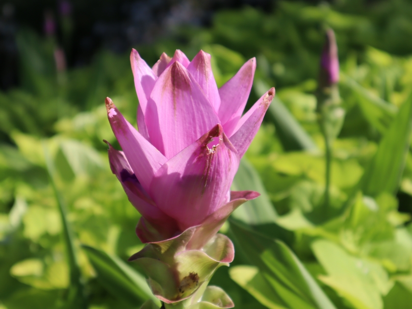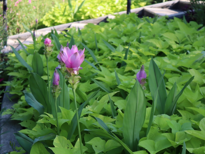 写真一・二枚目:クルクマ(場所:移ろいの庭階段花壇ほか)