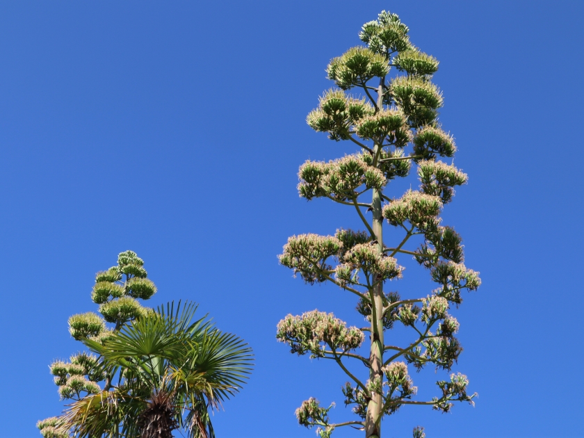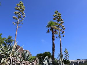 花の谷から空のテラスを見上げると、8メートル以上にまで伸びた3本のニョキニョキッとした植物、それがアオノリュウゼツランです。滅多に花が咲くことはなく、数十年かけてたった一度だけ咲き、その後は静かに枯れていきます。