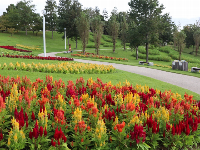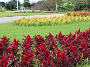 ポプラの丘の上段では、コスモスより一足早くケイトウが見頃です。