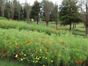 写真一・二枚目:ポプラの丘の様子、三枚目:大地の虹南花壇の様子、四・五枚目:大地の虹北花壇の様子、六枚目:コスモス「ダブルクリック」(場所:大地の虹北花壇)