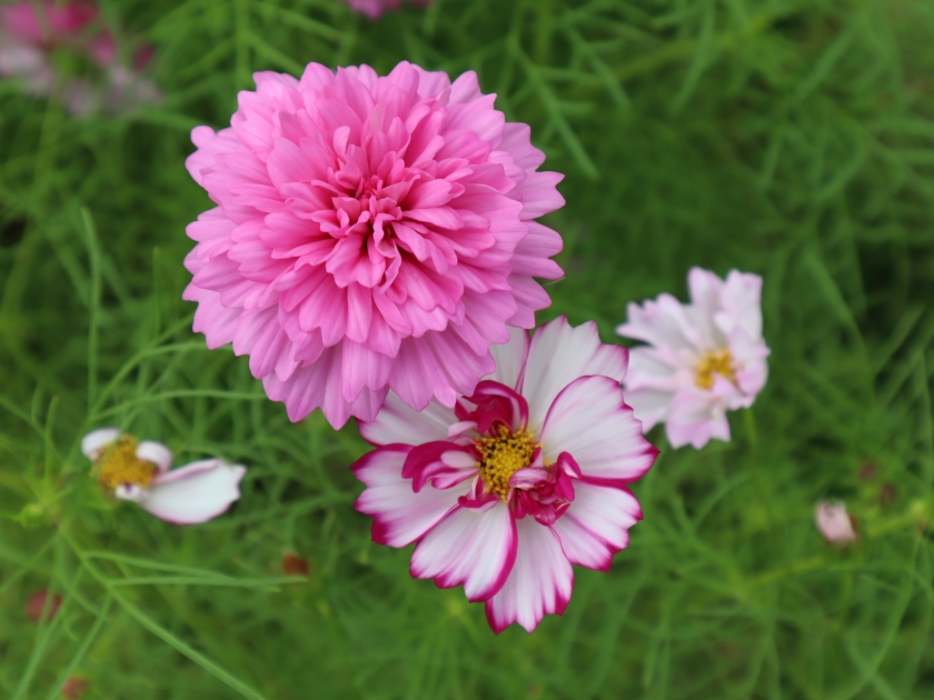 数輪の開花は去年より早かったのですが、そこから遅々として進まず、見ごろは去年同様10月に入ってからとなりそうです。咲き揃うのが早そうなのは、大地の虹北花壇の「ダブルクリック」という八重咲の品種です。