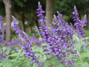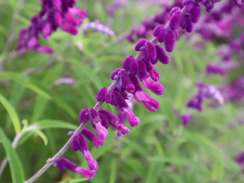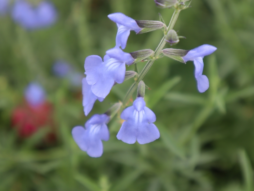 サルビア・レウカンサが先週より咲き始めました。ビロードのような手触りの花がこれからモサモサ増えます。サルビア「インディゴスパイアー」は暑い時期が終わったため復活。水色がきれいなサルビア・アズレアも咲き始めました。