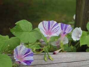 写真一枚目:西洋アサガオ「ミルキーウェイ」、二・三枚目:西洋アサガオ「ヴェニスブルー」、四枚目:キキョウ咲きアサガオ(場所:花の丘道