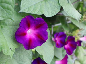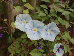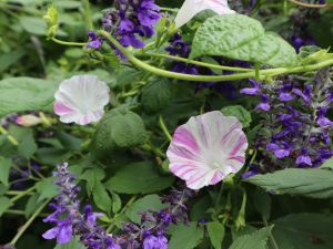 西洋アサガオは秋からが本番です。花の丘道のフェンス沿いで、サルビアにからんでいます。