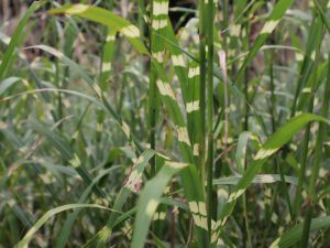 葉っぱに鷹の羽のような模様の入った、園芸品種のススキです。